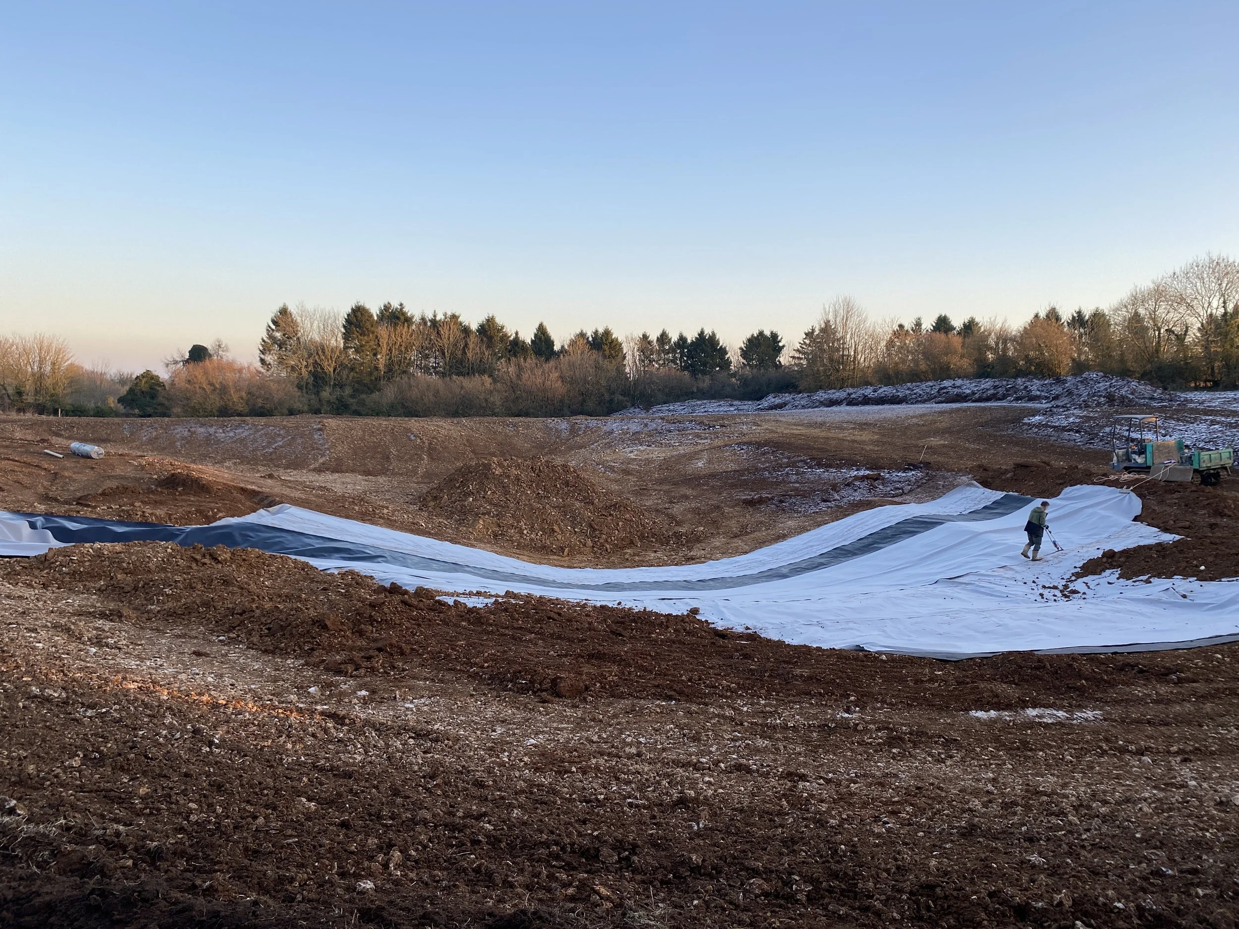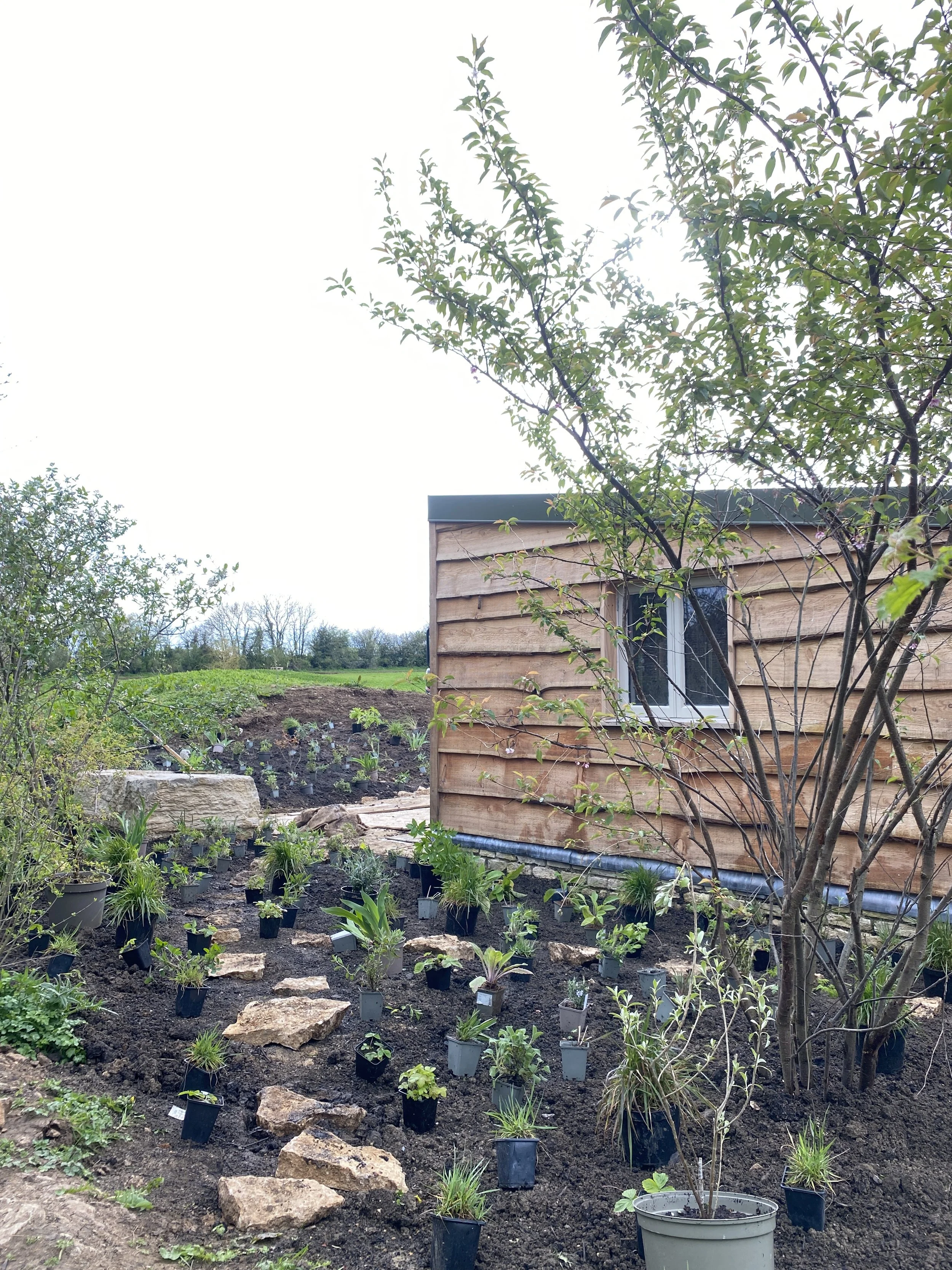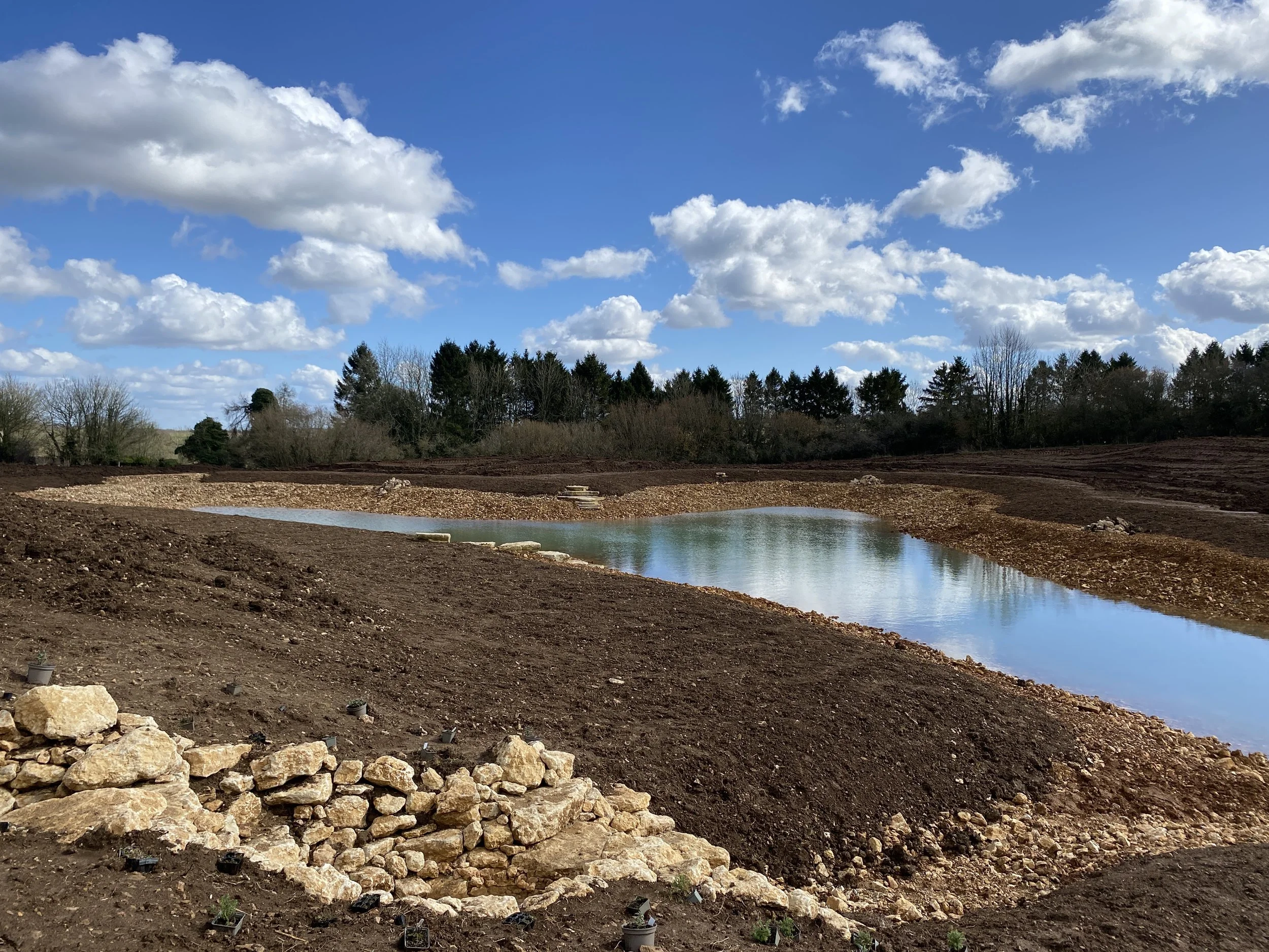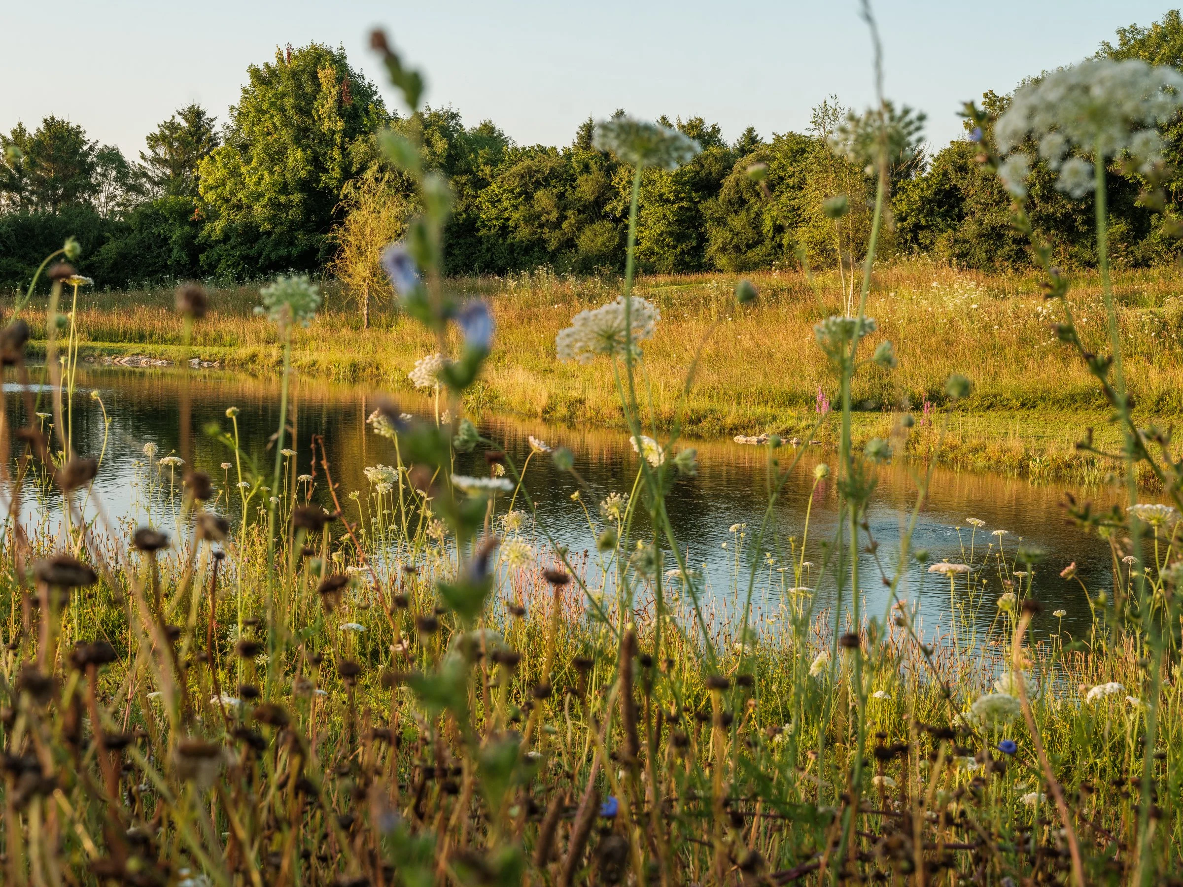 Landscape works took place to create a wildlife haven on this previously rye-grass dominated grazing field. Spring 2023 saw the completion of a new lake, which is a key component of the scheme for drawing in birds, insects and other creatures, making it come alive with the sound of splashing wings, bird song and buzzing dragonflies. Set within an AONB, the local landscape character is reflected in the plant palette both with perennials, seeds as well as with tree and shrub choices. To reintroduce lost biodiversity, the field has been sown with locally sourced wildflower seeds, containing some 30 different species, interplanted with native perennials and bulbs.