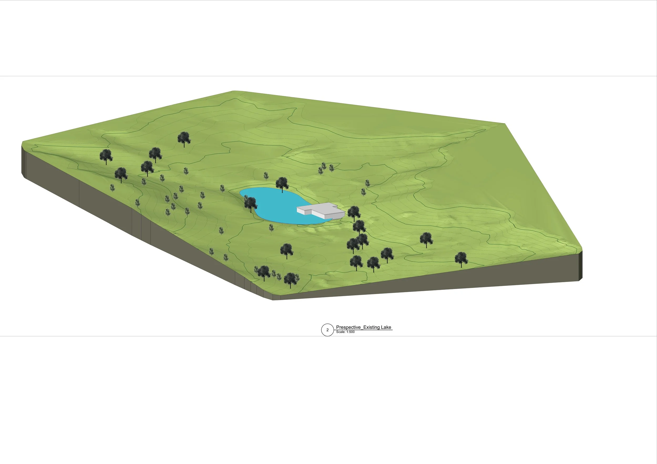 Desktop study with 3D model of existing contours, tree locations & water run-off directions