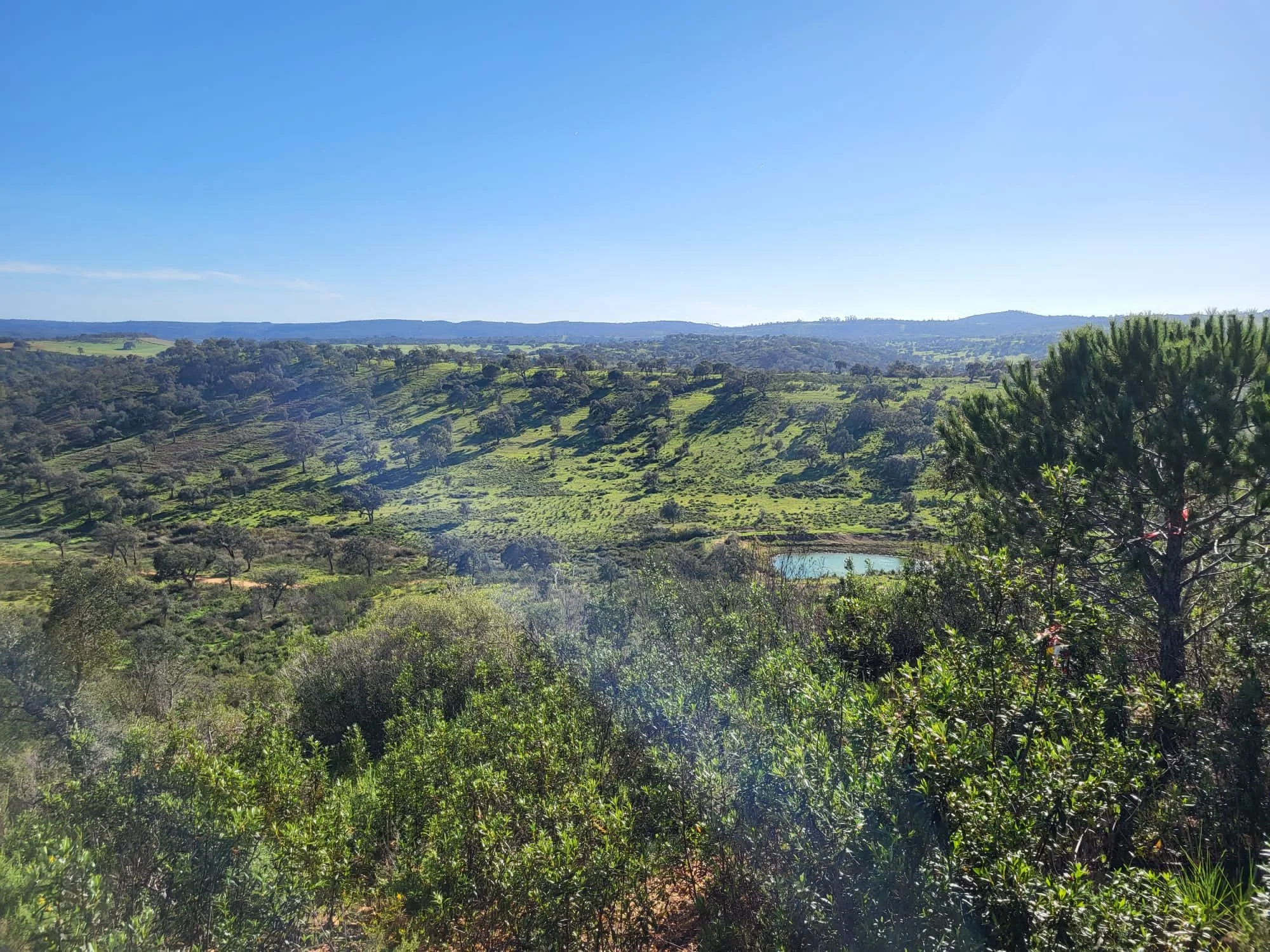 The ecosystem is defined by a sharp difference from hillsides to the narrow meandering lowlands. Lush green deciduous trees and grasslands, usually grazed or used for intensive agricultural systems, contrast with resinous shrubs and cork oak trees, where the wildflower meadows last just for a couple of weeks in April with drought setting in thereafter.